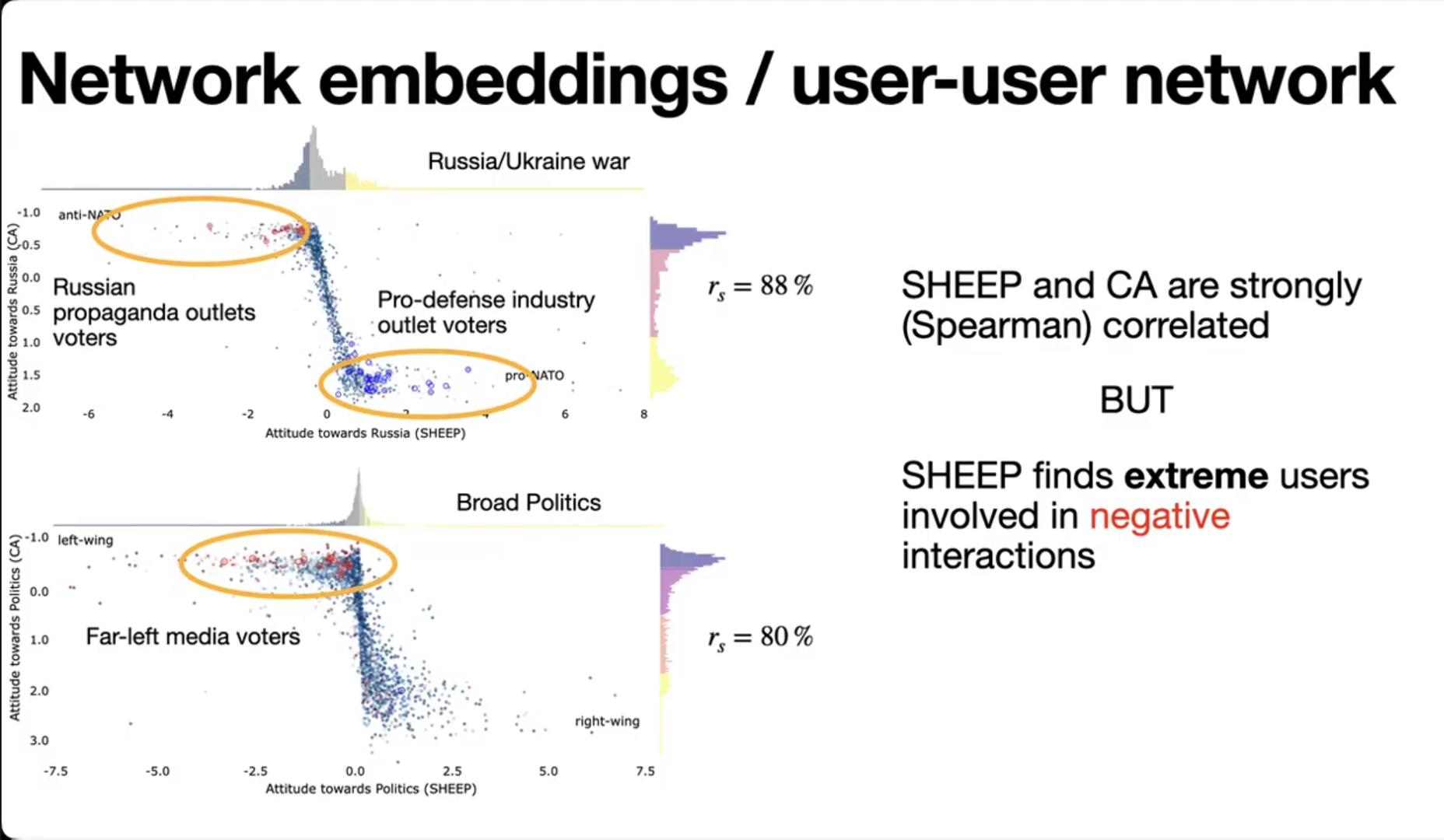 Elena presented work on online ecosystems and their role in amplifying polarization. By analyzing a Spanish Reddit-like platform, she applied network embeddings to capture sentiment outliers, propaganda, and industry outlets. Her results suggest certain embedding methods are better suited for signed networks with negative interactions.